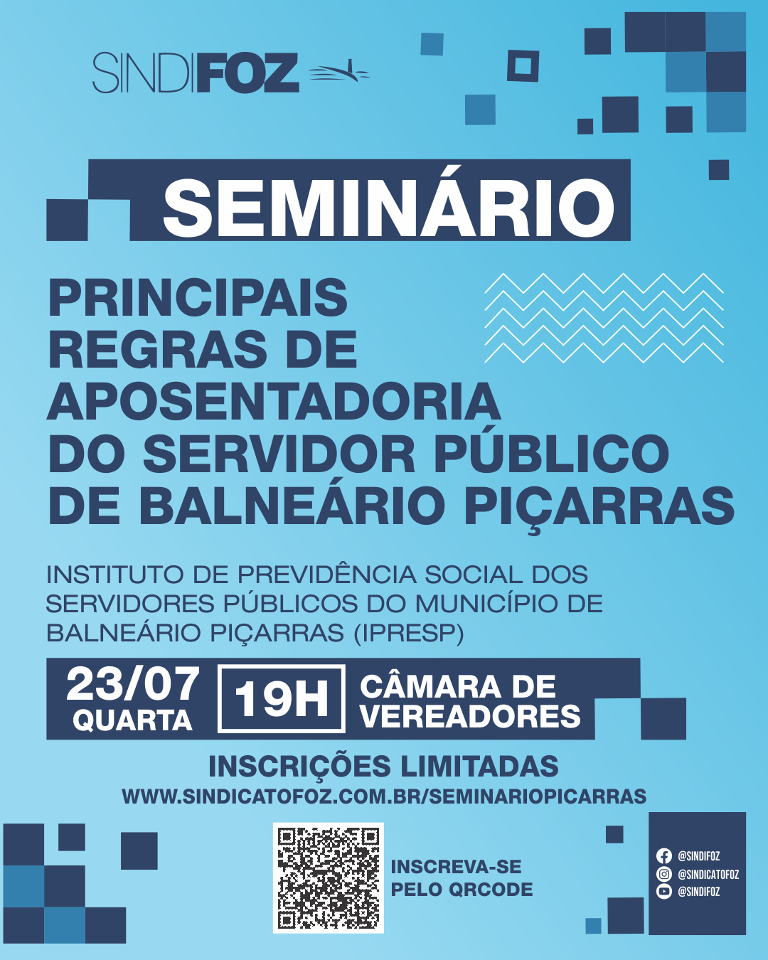 O Sindifoz, em parceria com o IPRESP, realiza no dia 23/07 o seminário “Principais Regras de Aposentadoria do Servidor Público de Balneário Piçarras”. O evento acontece na Câmara de Vereadores, a partir das 19h, com inscrições limitadas.