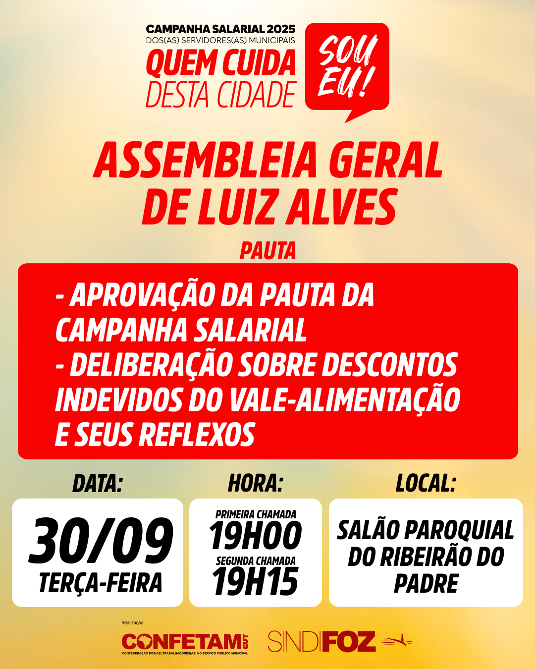 O Sindifoz realiza Assembleia Geral com os servidores públicos municipais de Luiz Alves na próxima terça-feira (30/09), às 19h, no salão paroquial do Ribeirão do Padre, para aprovação da pauta da Campanha Salarial e deliberação sobre descontos indevidos do vale-alimentação e seus reflexos. Sua participação é muito importante!