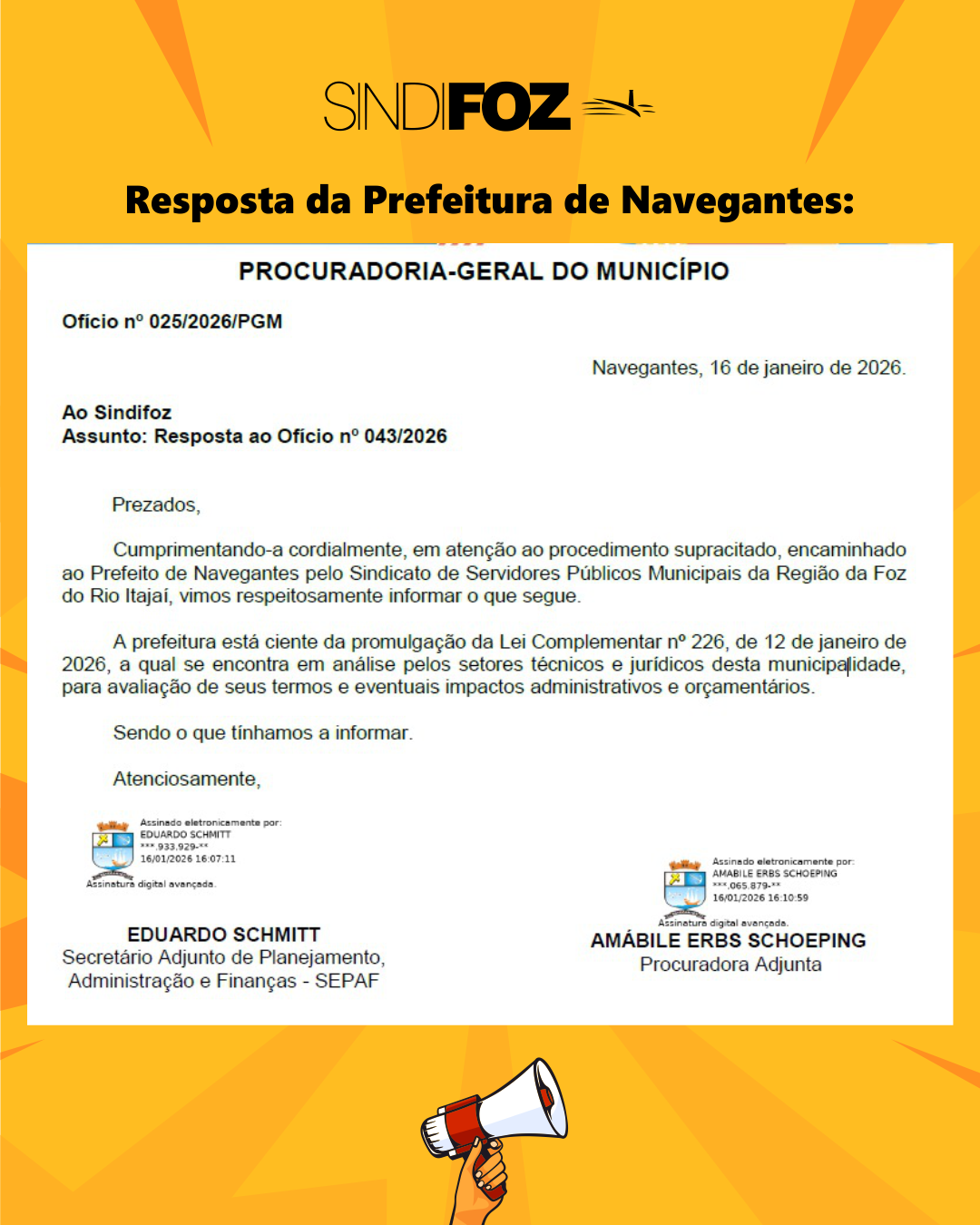 A Prefeitura de Navegantes, através da sua Procuradoria Geral, respondeu nesta semana ao ofício do Sindifoz que solicitava a aplicação da Lei Federal 226/26, que descongelou o tempo de serviço dos servidores públicos municipais suspensos pela Lei 173.