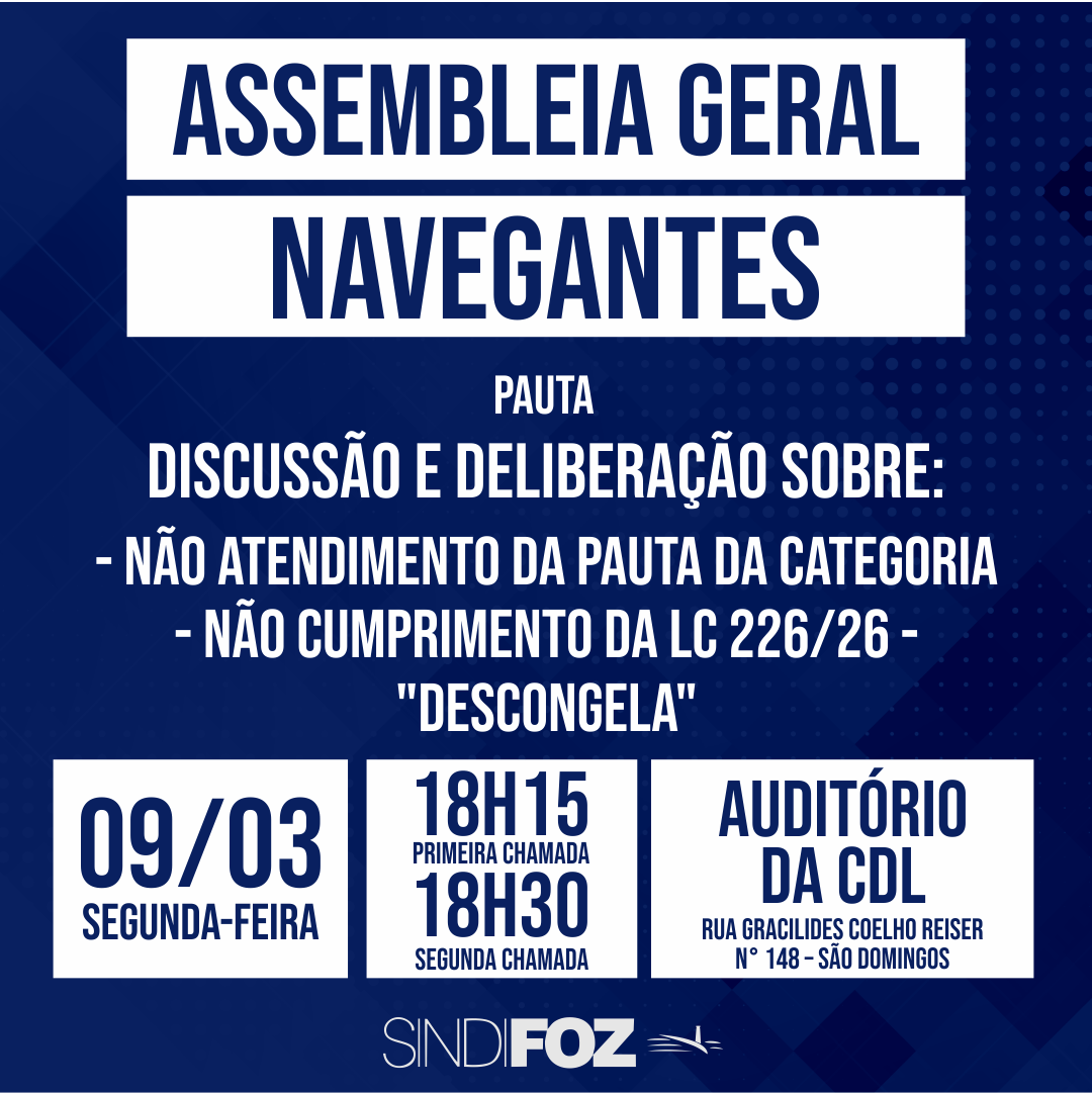 O Sindifoz realiza Assembleia Geral com os servidores públicos de Navegantes no dia 09/03 (segunda-feira), às 18h30, no auditório da CDL, para discussão e deliberação sobre as seguintes pautas: