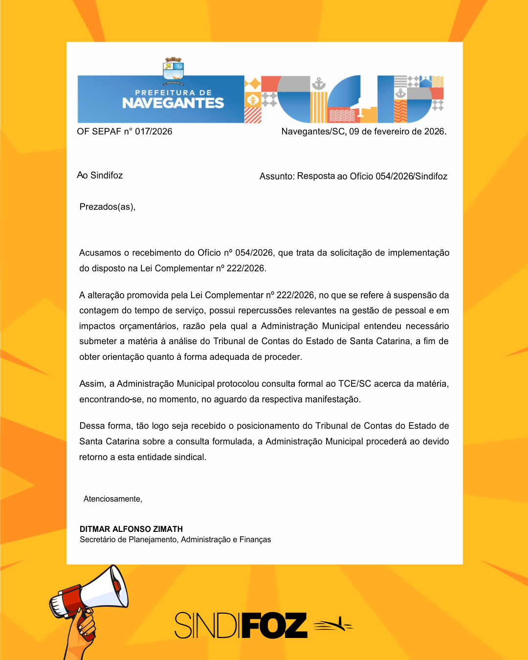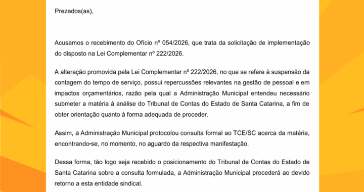 A Lei Federal 226/26, que ficou conhecida como Descongela, foi publicada no dia 12 de janeiro, e desde então, o prefeito Liba, de Navegantes, foi notificado pelo Sindifoz e até o momento não cumpriu. O descongelamento e retomada imediata da contagem de tempo para triênio de licença-prêmio é inquestionável, até porque foi revogado o dispositivo da Lei 173 que, lá em 2020, suspendeu a contagem do tempo. O único assunto que caberia discussão é o levantamento de valores seriam os pagamentos retroativos.